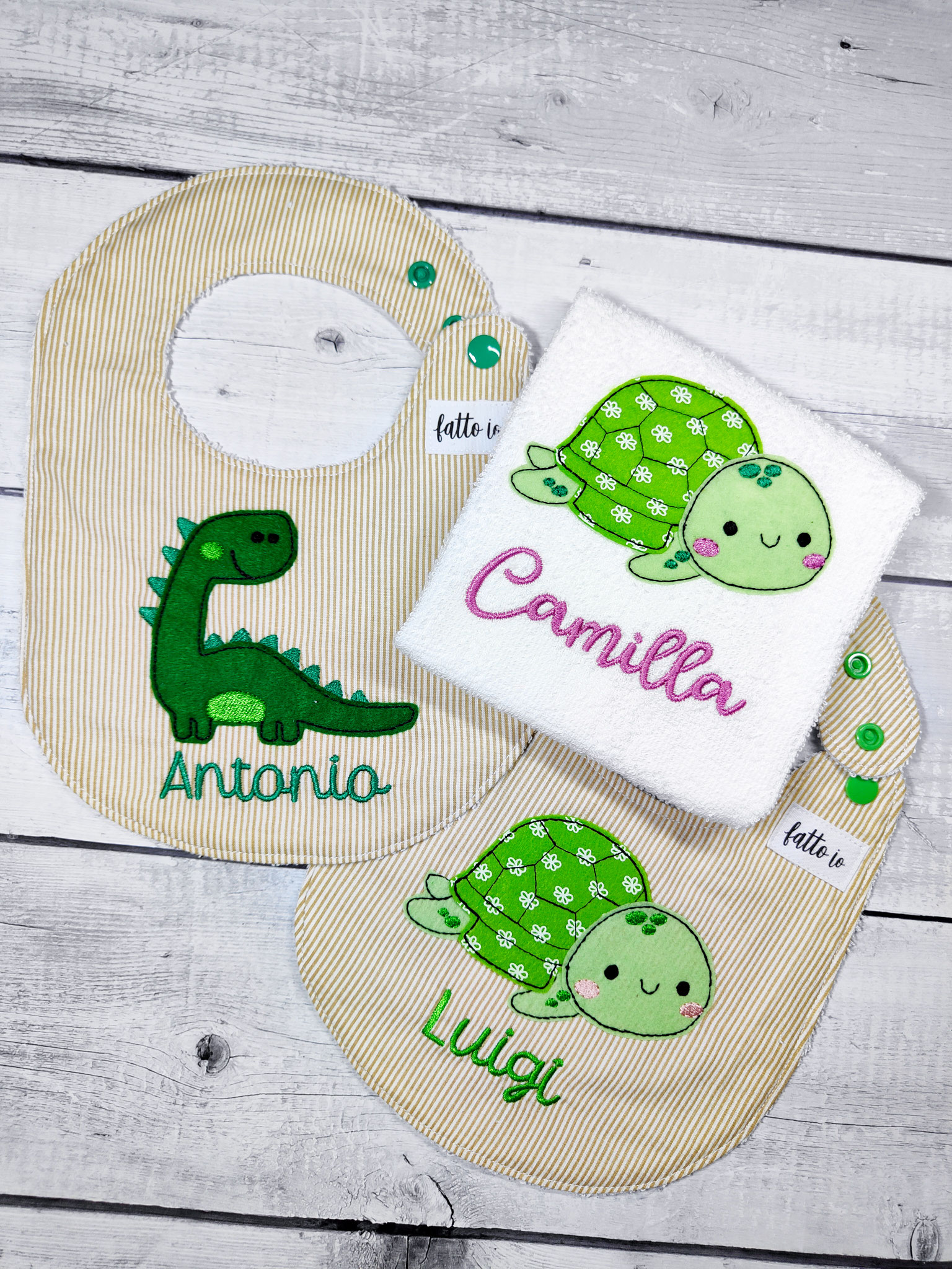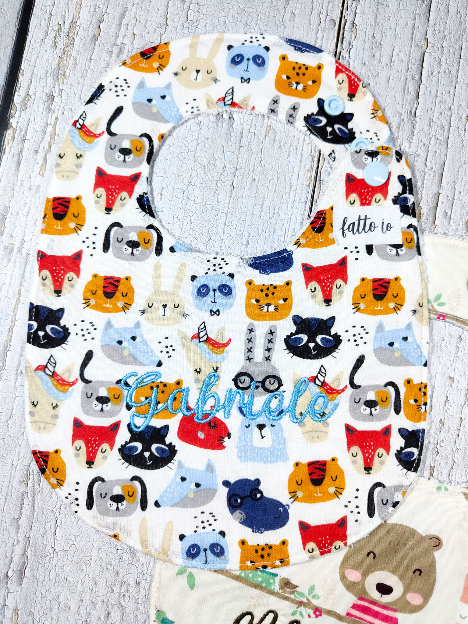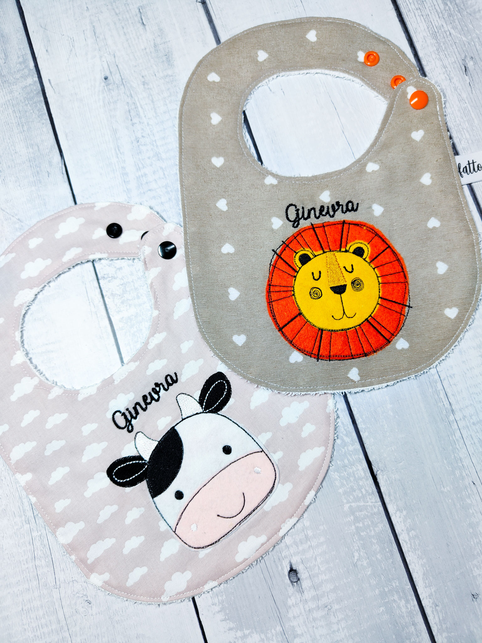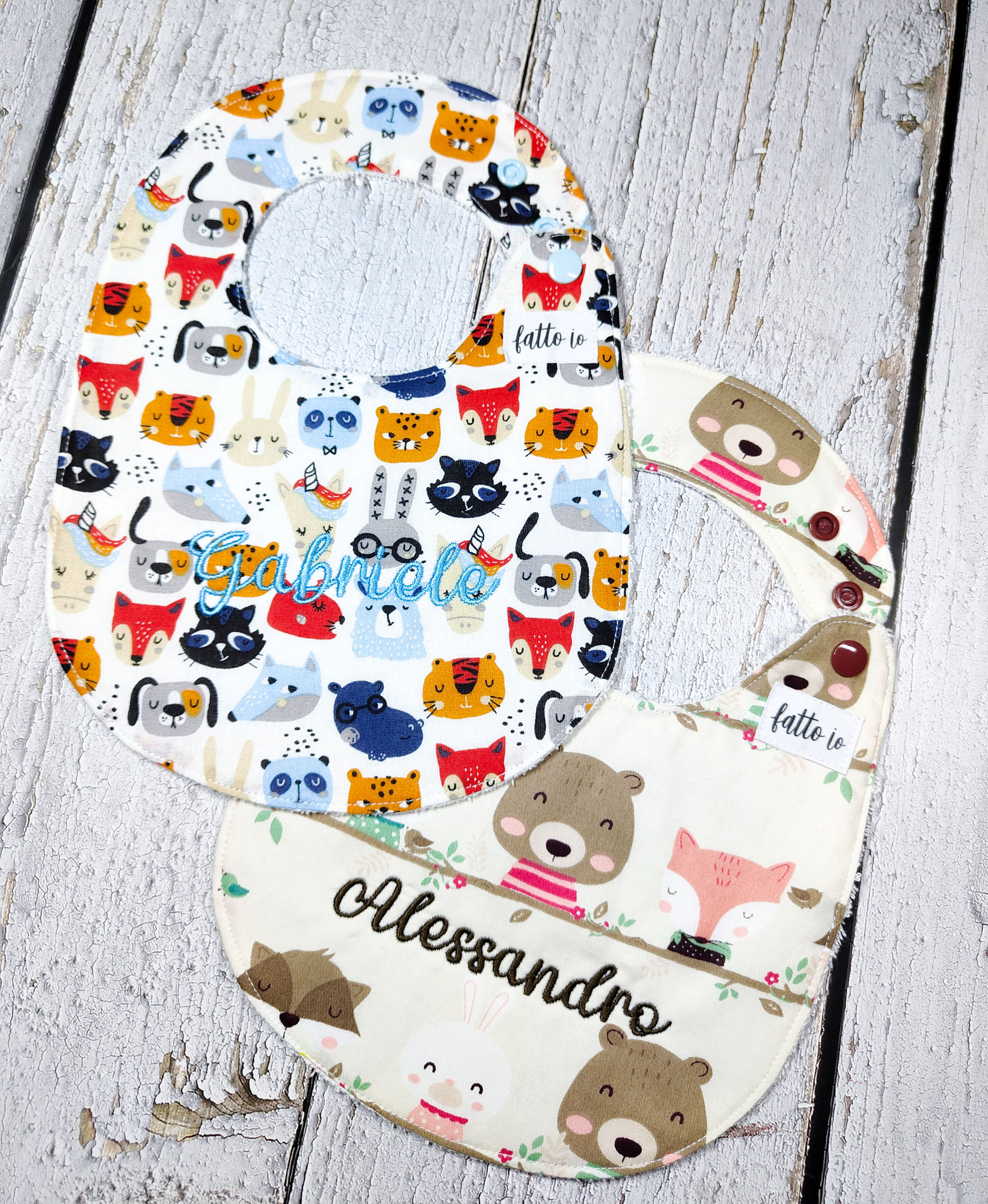Misura: 26 x 20 cm, ideale fin dai primi mesi fino ai 18/24 mesi.Bavaglia in Spugna di cotone (colore a scelta) e tantissimi disegni ricamati tra cui scegliere.