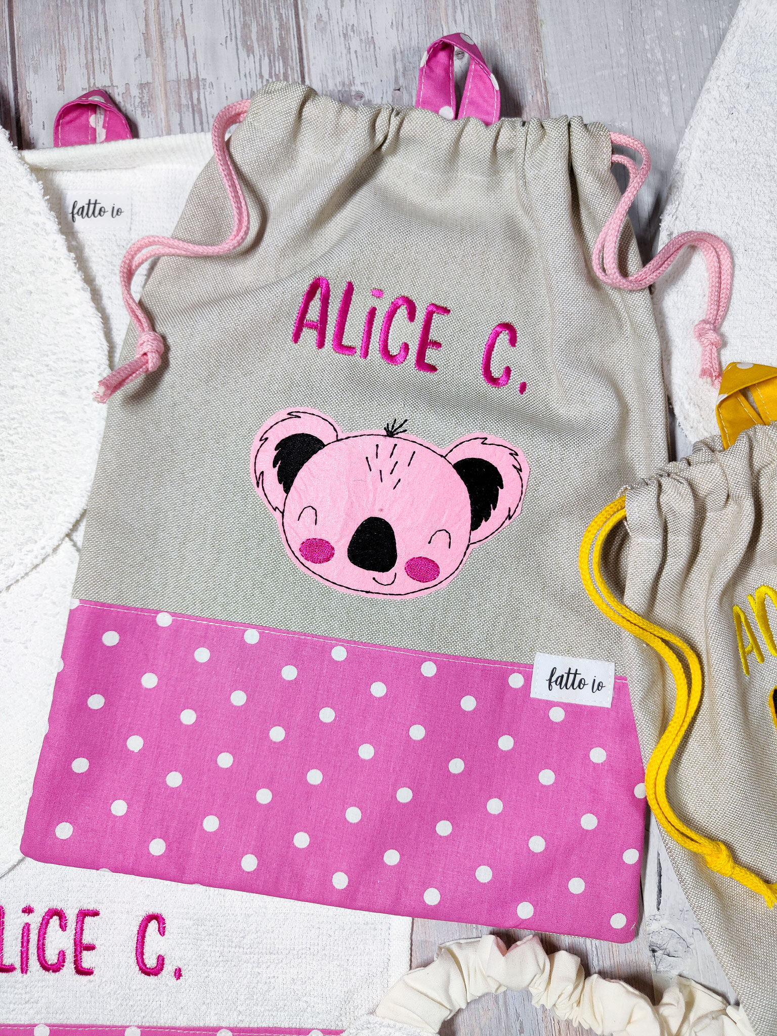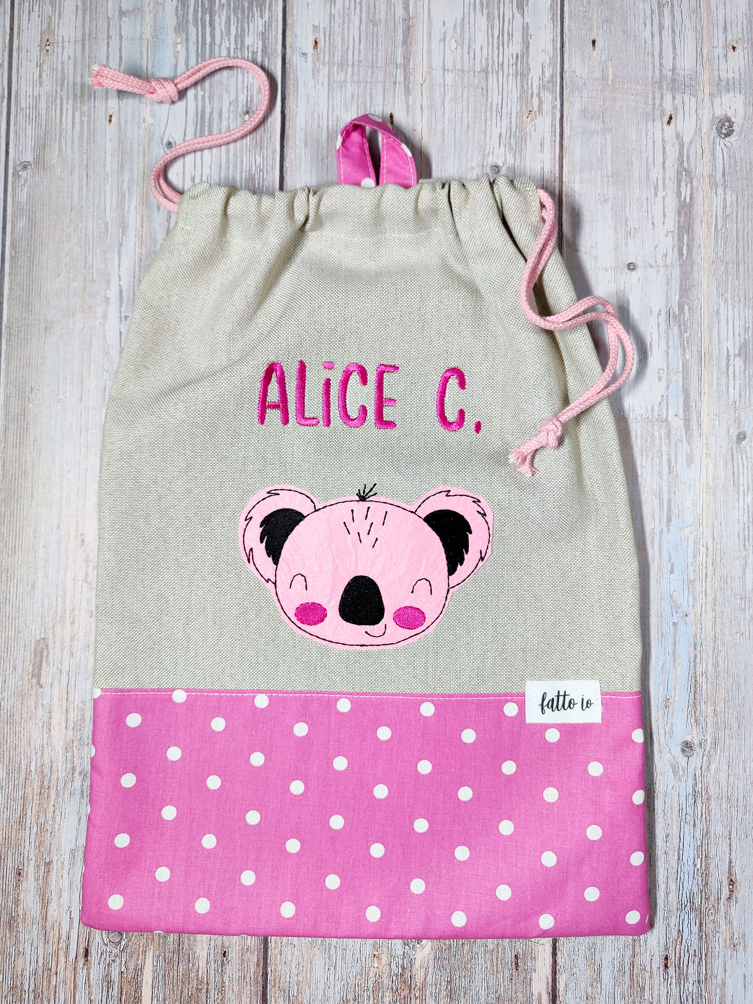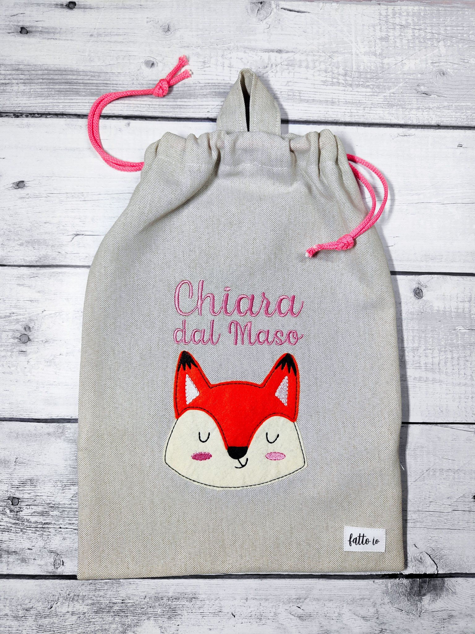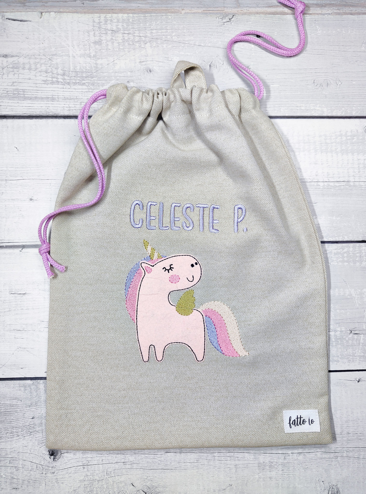 Sacca in cotone grezzo color canapa con cordino di chiusura (colore a sorpresa in tono).