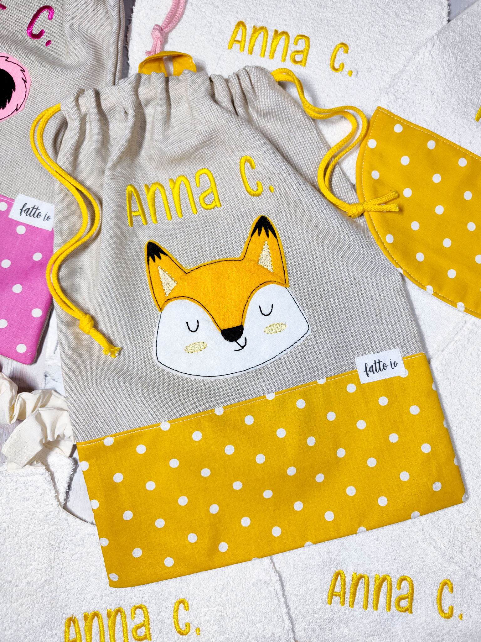 Cordini di chiusura in corda colore a sorpresa abbinati al tessuto scelto.