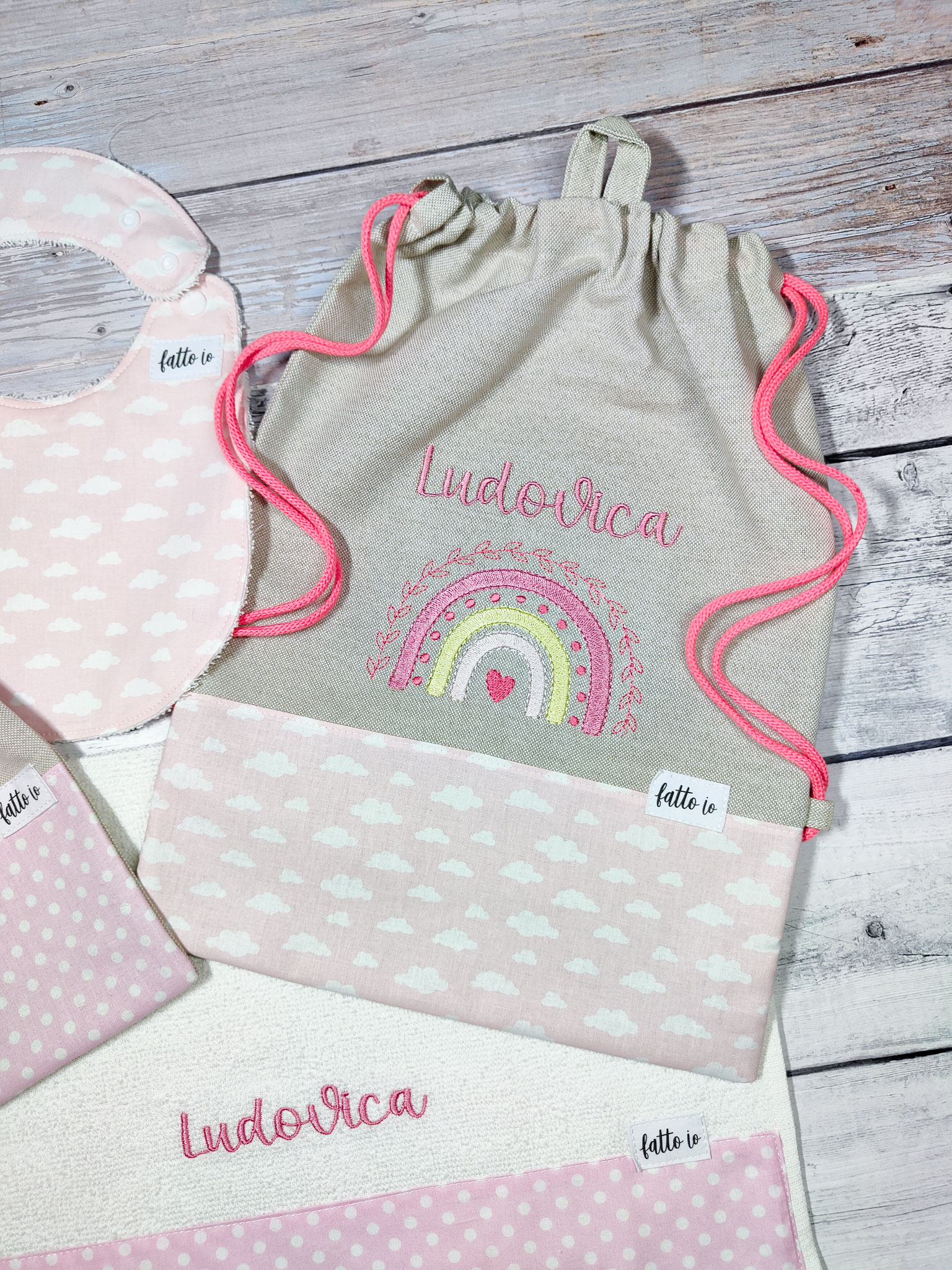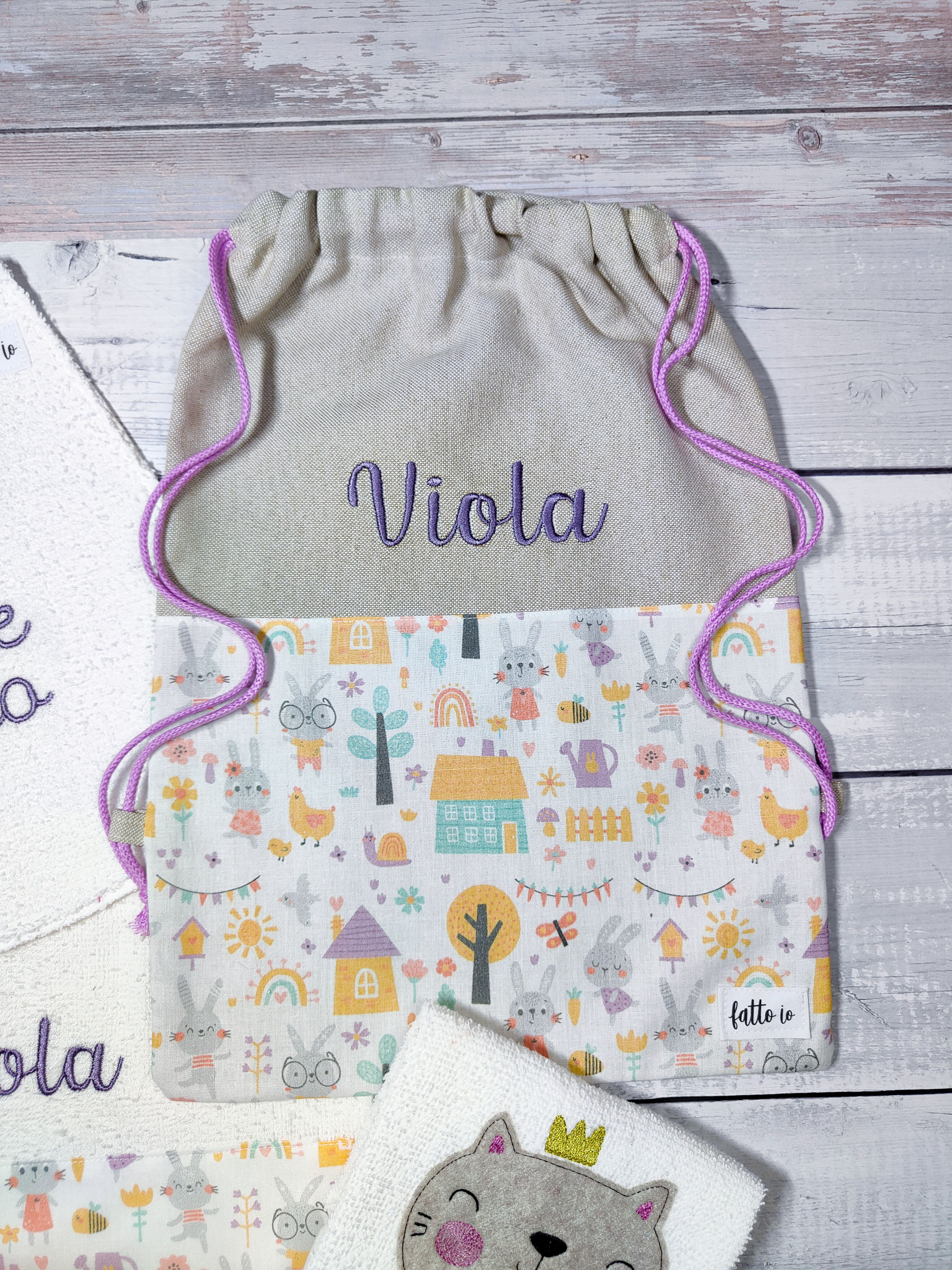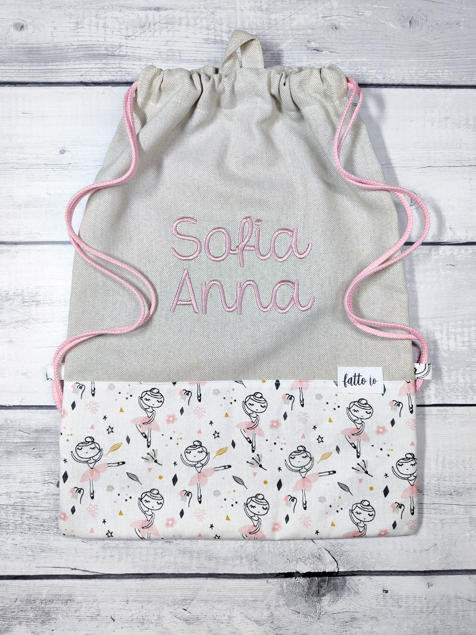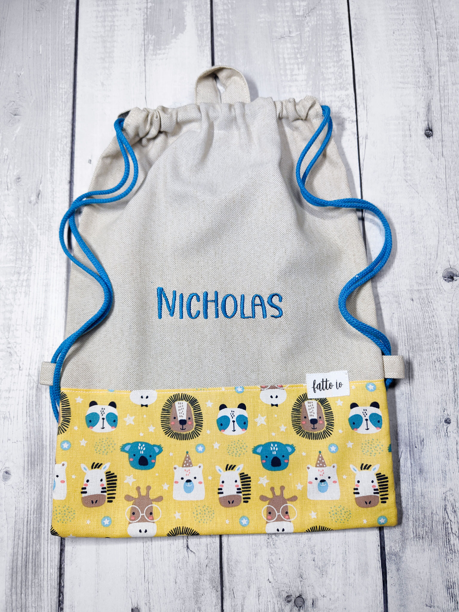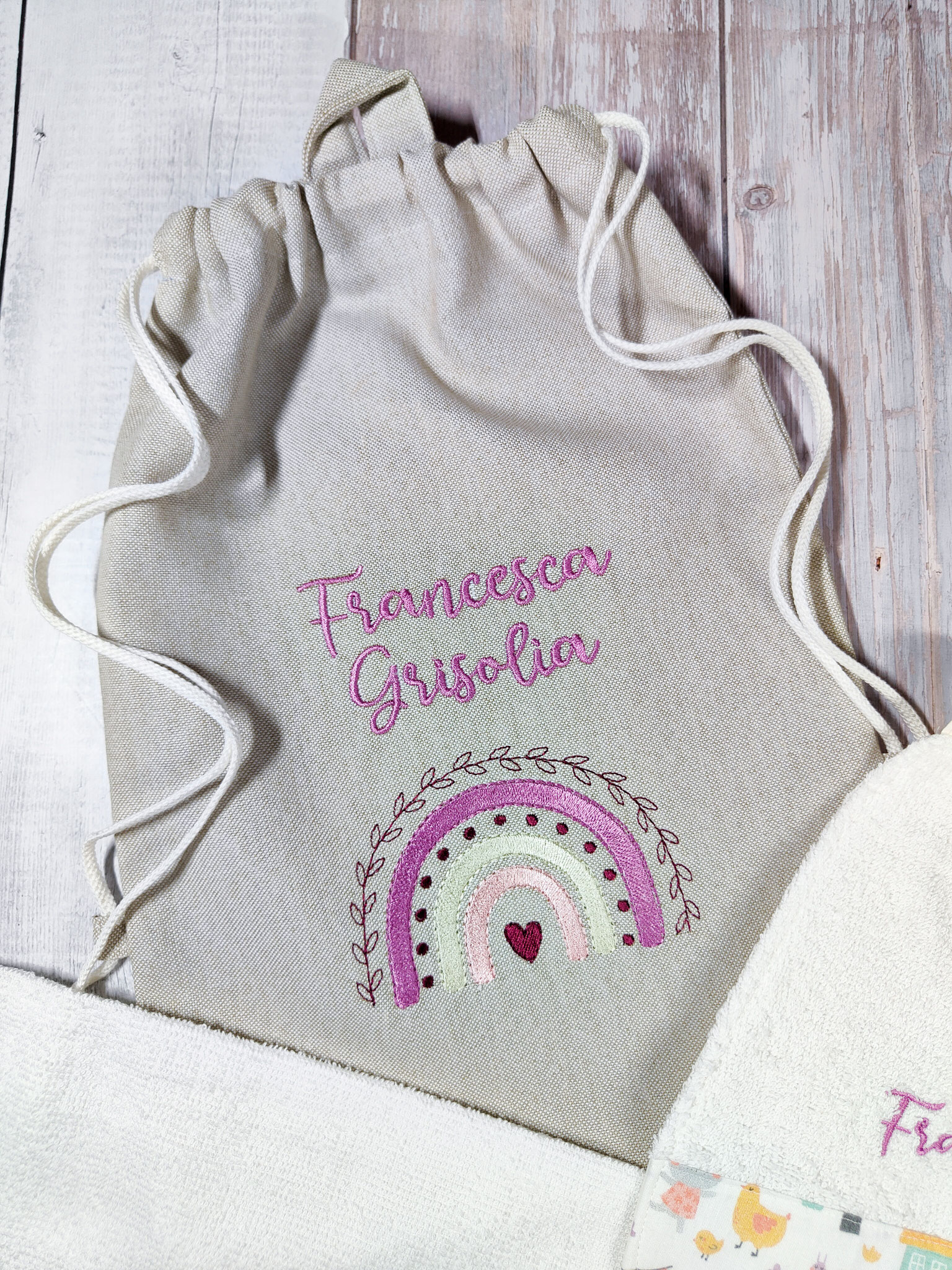 Zainetto in cotone grezzo canapa con spallacci colorati abbinati ai ricami.