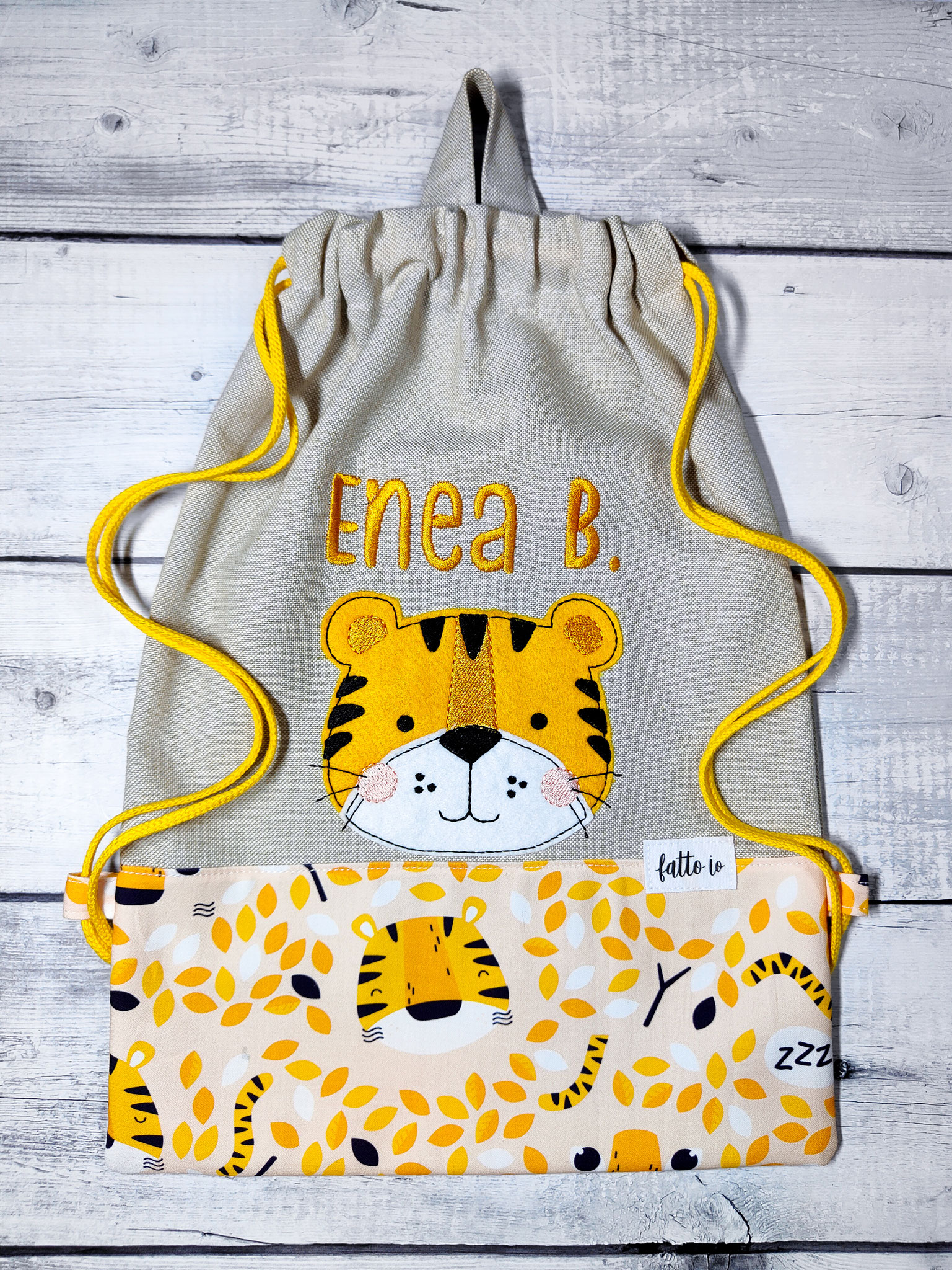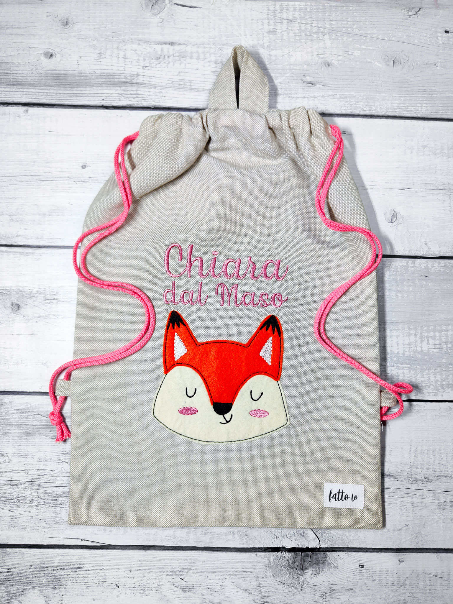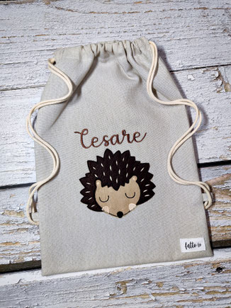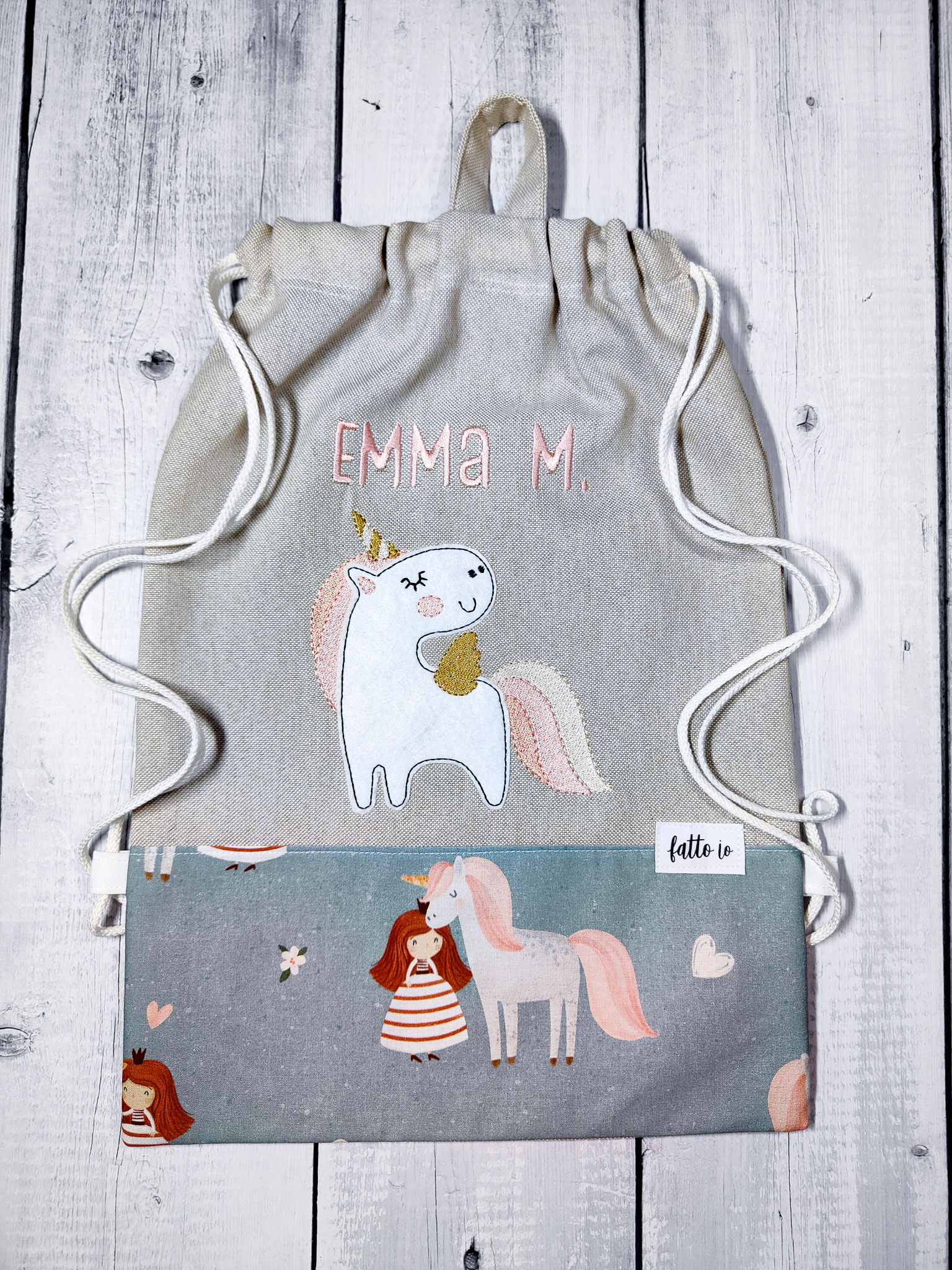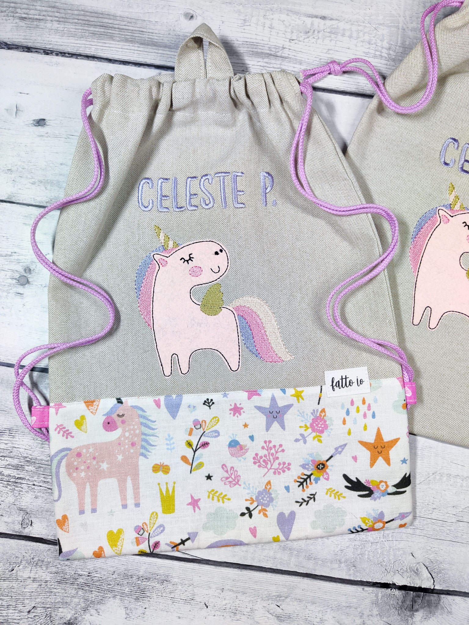Zainetto in cotone grezzo canapa con spallacci colorati abbinati ai ricami.