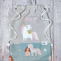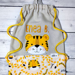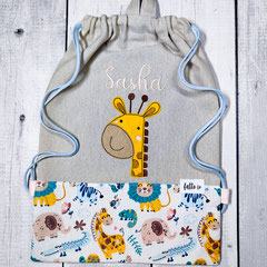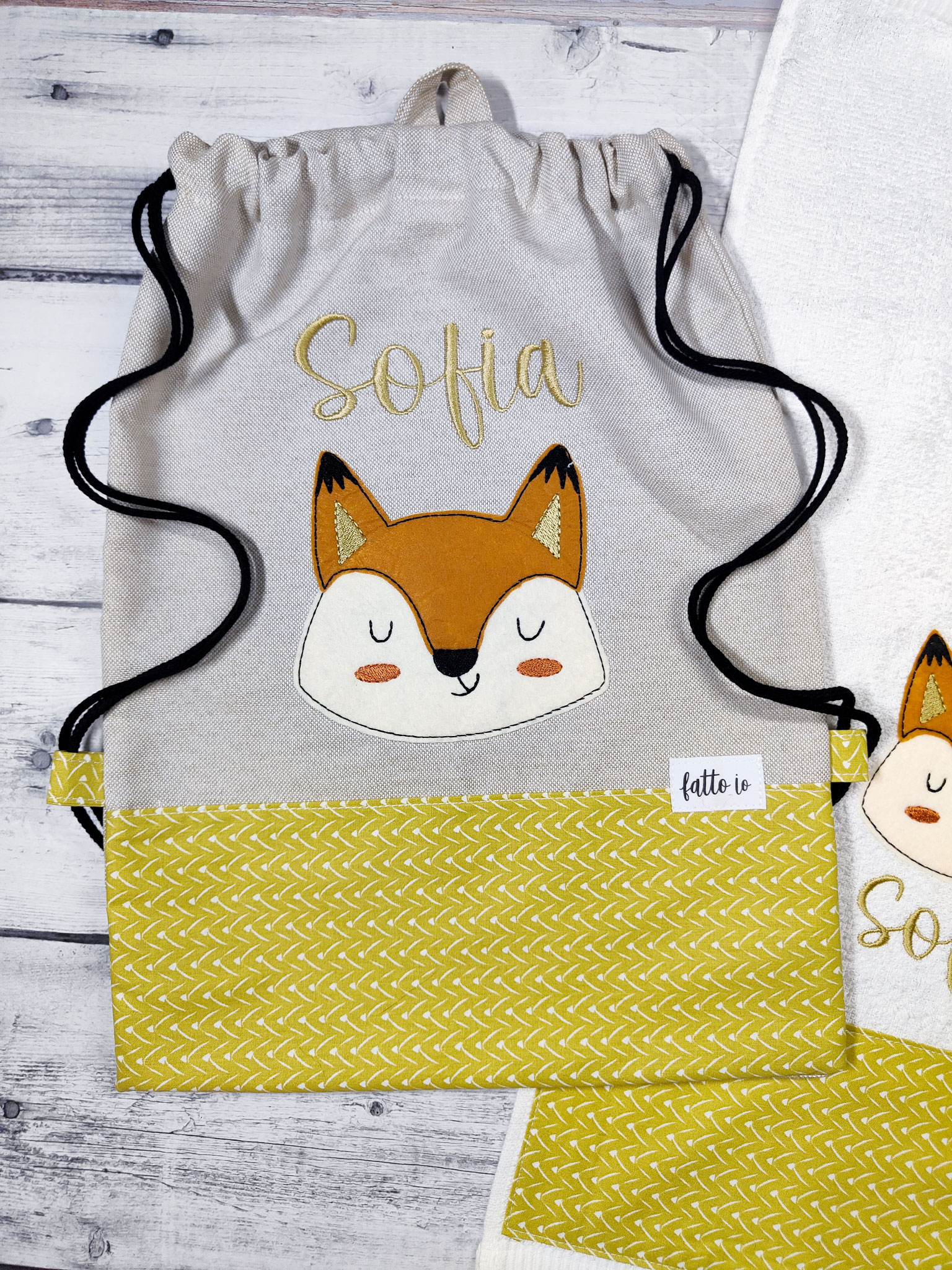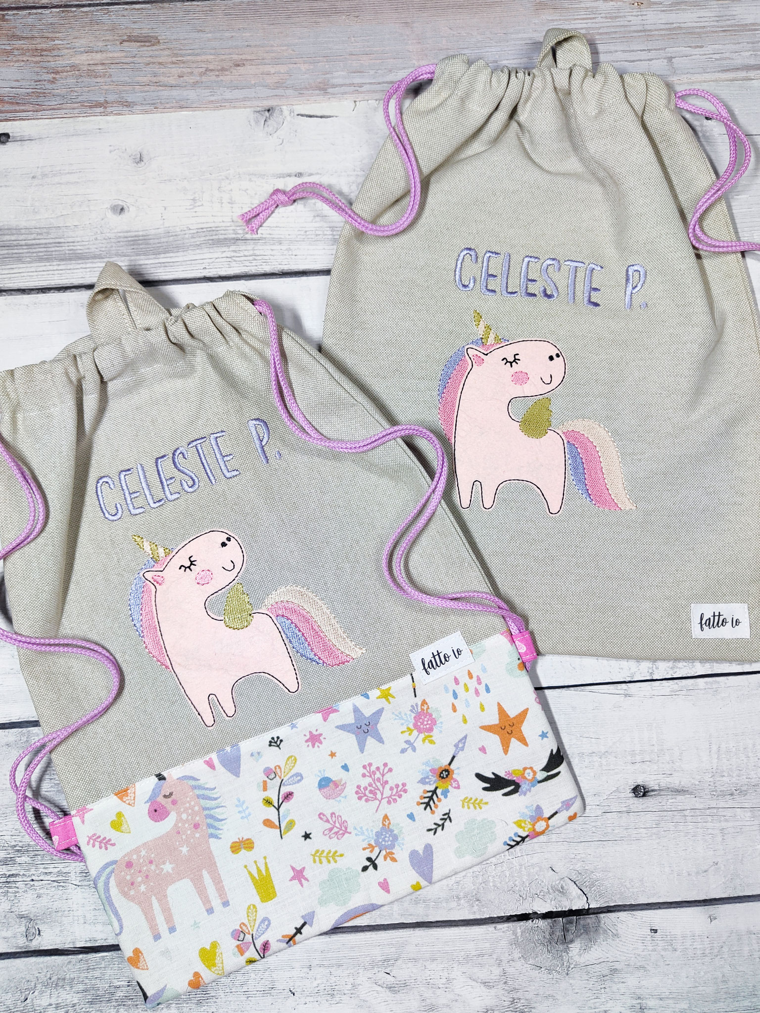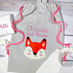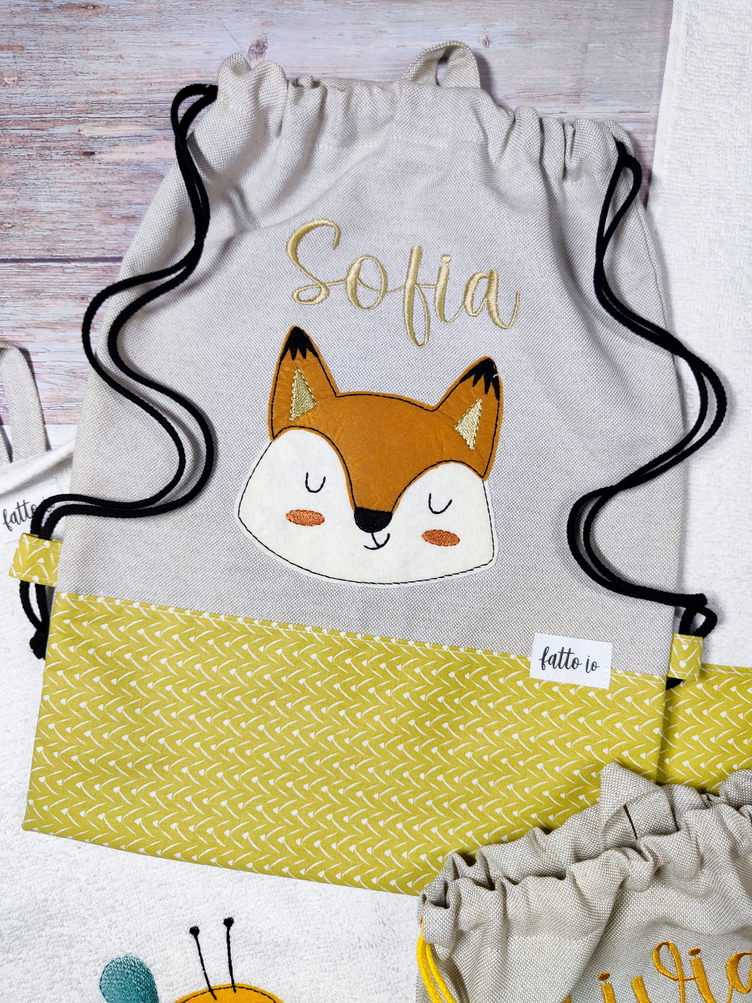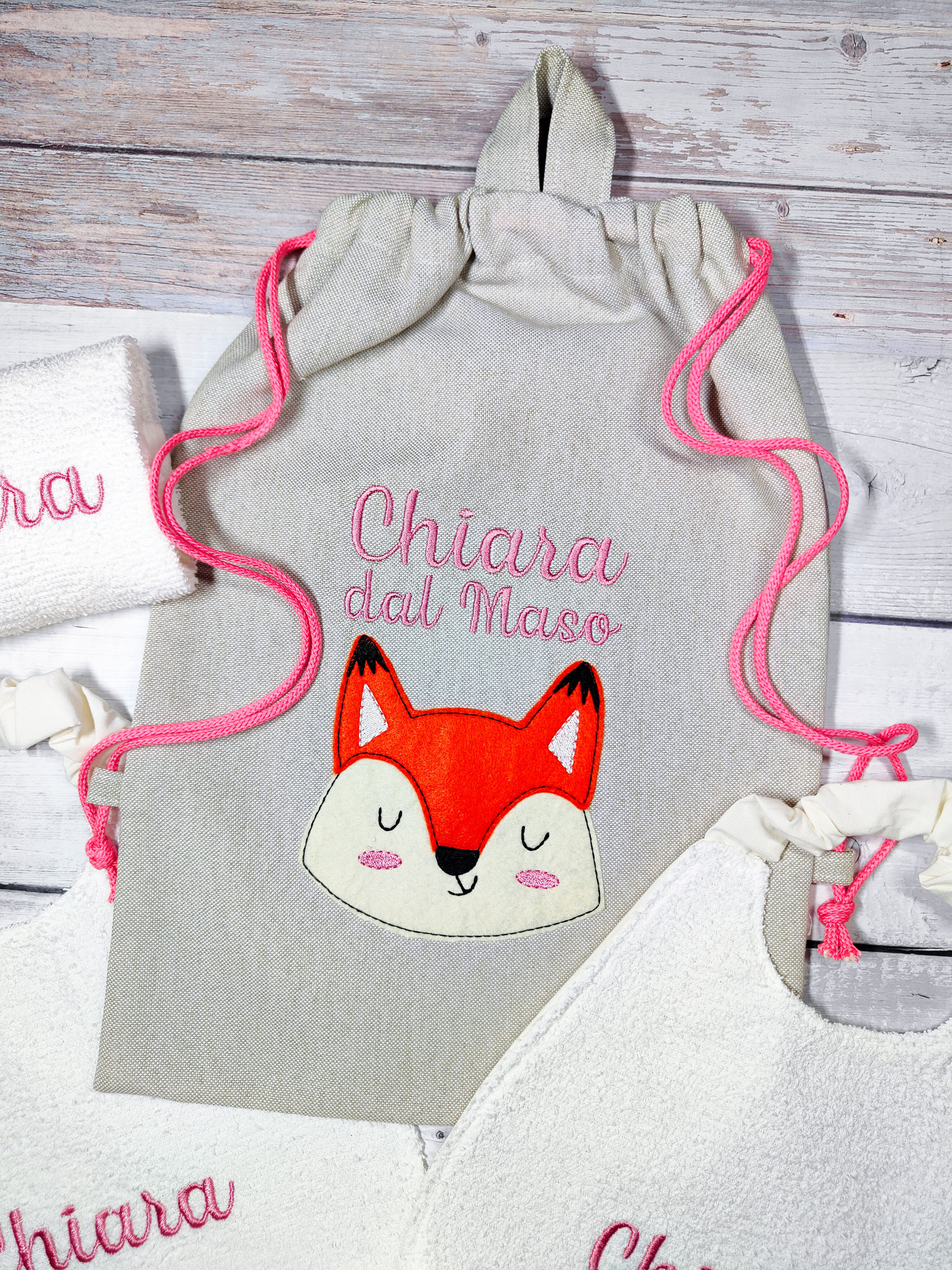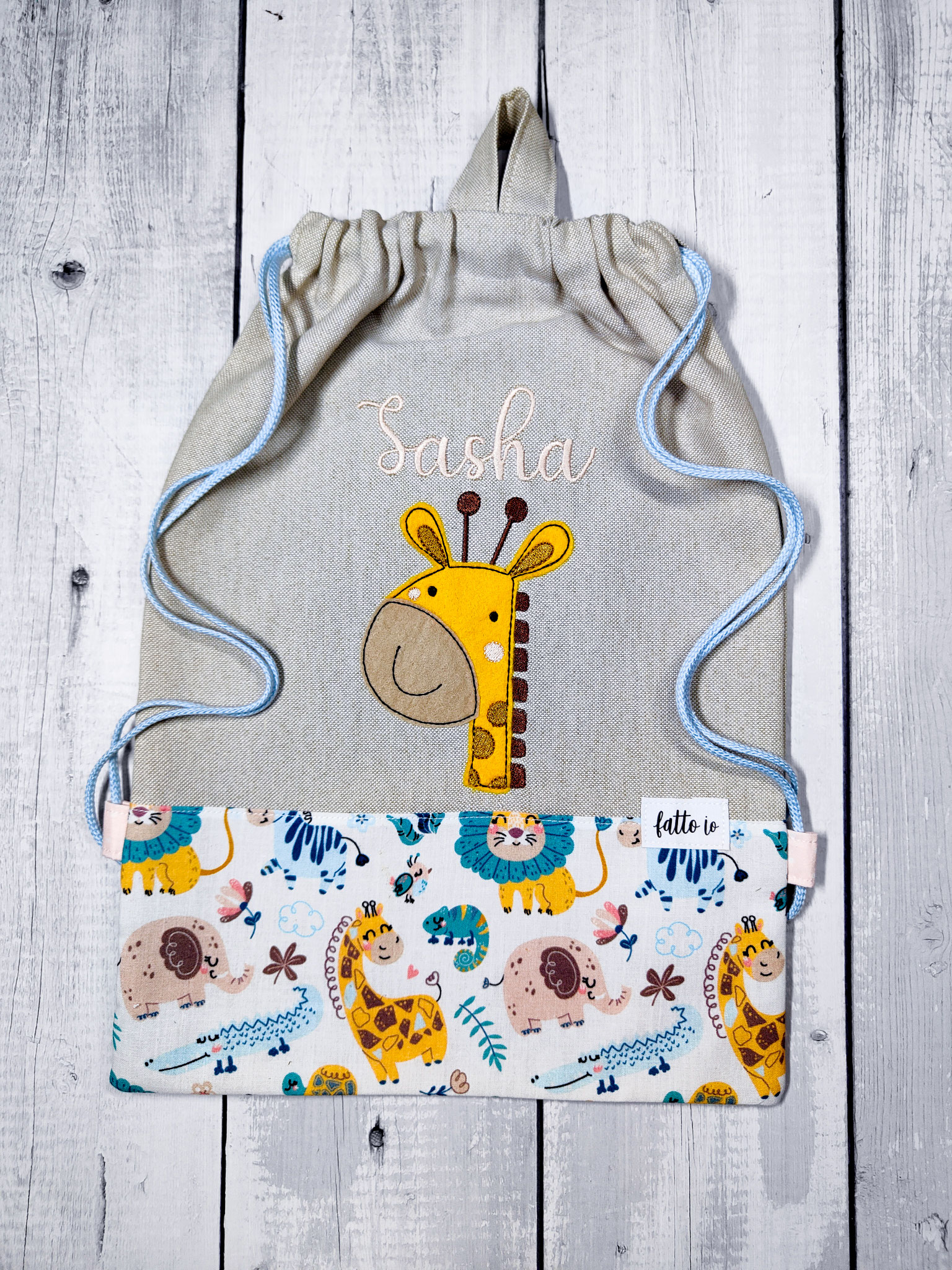 Zainetto in cotone grezzo canapa con spallacci colorati abbinati ai ricami.