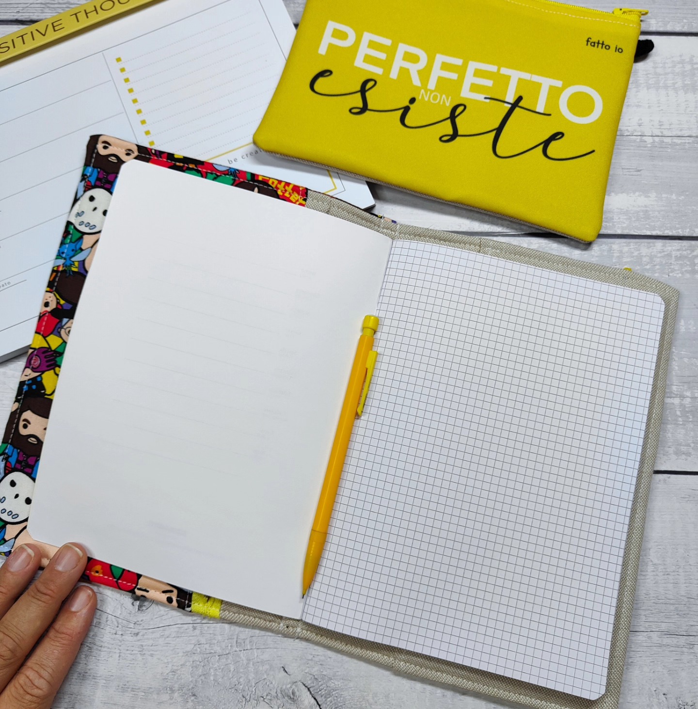 sostituisci il quaderno con un libro ed avrai una copertina perfetta per non piegare nessuna pagina.